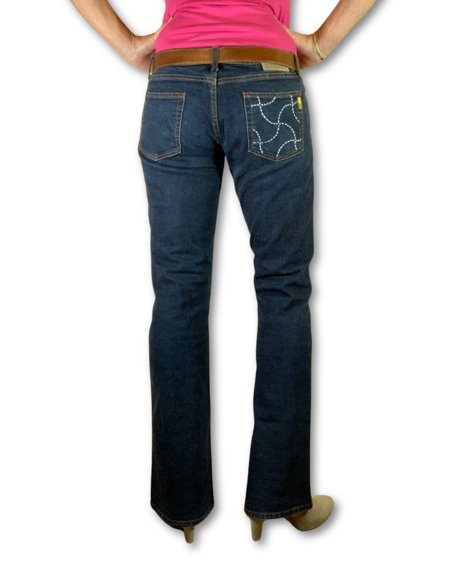 This denim has a five-pocket design with a front zip & metal top button fastening.